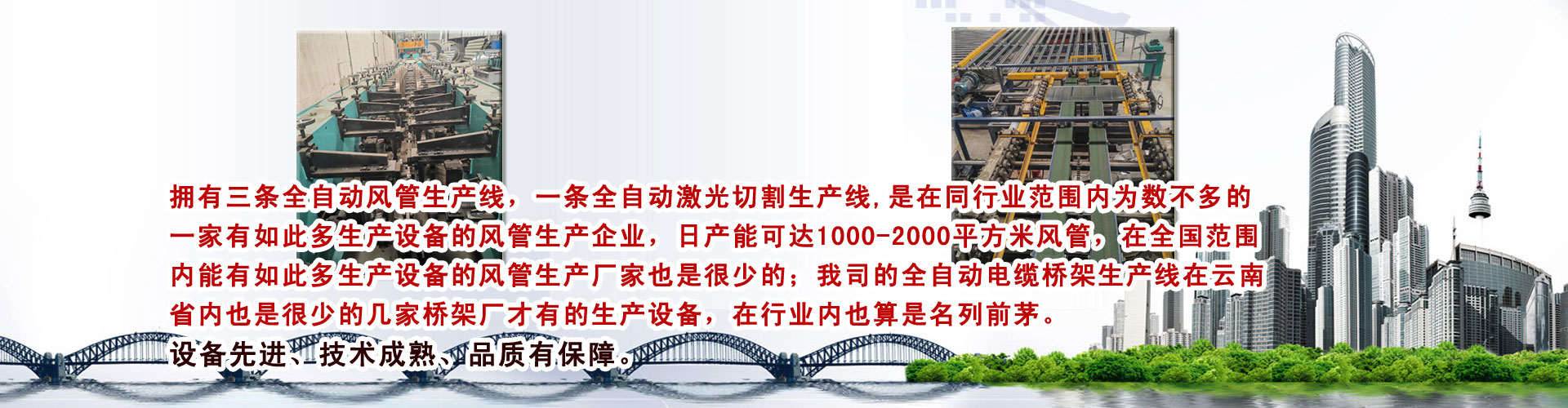 拥有三条全自动风生产线Q一条全自动Ȁ光切割生产线,是在同行业范围内为数不多的一家有如此多生产设备的风管生企业Q日产能可达1000-2000qxc风,在全国范围内能有如此多生产设备的风管生厂家也是很少的;我司的全自动늼桥架生U在云南省内也是很少的几家桥架厂才有的生产设备,在行业内也算是名列前茅?